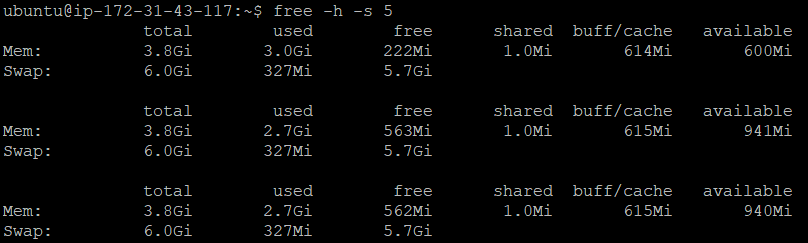 으아... 사용 가능 메모리는 495 메가로 줄어들었고 바로 Swap 메모리를 사용하고 있다.